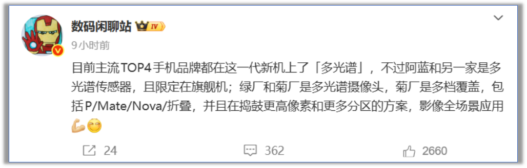 数码博主数码闲聊站指出恒瑞易配,多家手机品牌正在布局多光谱摄像头传感器。虽然部分厂商仅将其用于旗舰机型,但华为已全面覆盖三大产品线:Mate、Pura和Nova。
