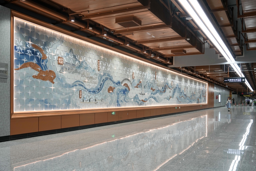 记者在现场看到,站厅整体为玫瑰金色调鸿E配资,彰显大气。层内最显眼的就是《蟠龙十景》,这面公共艺术墙是站厅的“文化灵魂”。设计团队从《蟠龙镇志》中提取“江村野店、曲水萦居、柳榆晚照”等十大景致,采用激光雕刻瓷片呈现轮廓,镌刻于艺术墙长卷之上,通过水刀切割的瓷片拼合形成古镇肌理,瓷片缝隙则暗藏嵌入式LED灯带,灯光亮起时如繁星闪烁、似波光流转,碰撞出时空褶皱,带给乘客“一步一景、一时一境”的沉浸式体验,仿佛“一步穿越千年”,实现历史文化与当代艺术的生动对话。